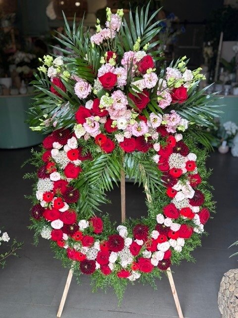La couronne sur pied est une composition florale de deuil élégante et imposante, conçue pour rendre un dernier hommage solennel. Réalisée avec des fleurs fraîches piquées dans la mousse, elle repose sur un support stable et raffiné.