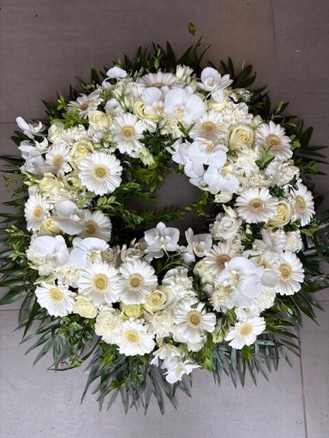 Symbole d’éternité et de respect, cette couronne de fleurs rend hommage avec élégance et sobriété.