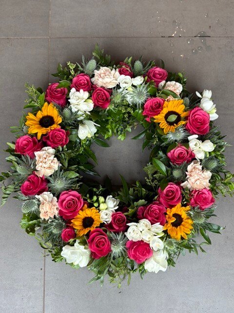 La couronne de deuil est une composition florale circulaire symbolisant l’éternité. Réalisée avec des fleurs piquées dans la mousse sur un socle biodégradable, elle exprime un hommage naturel et élégant. À partir de 200€.