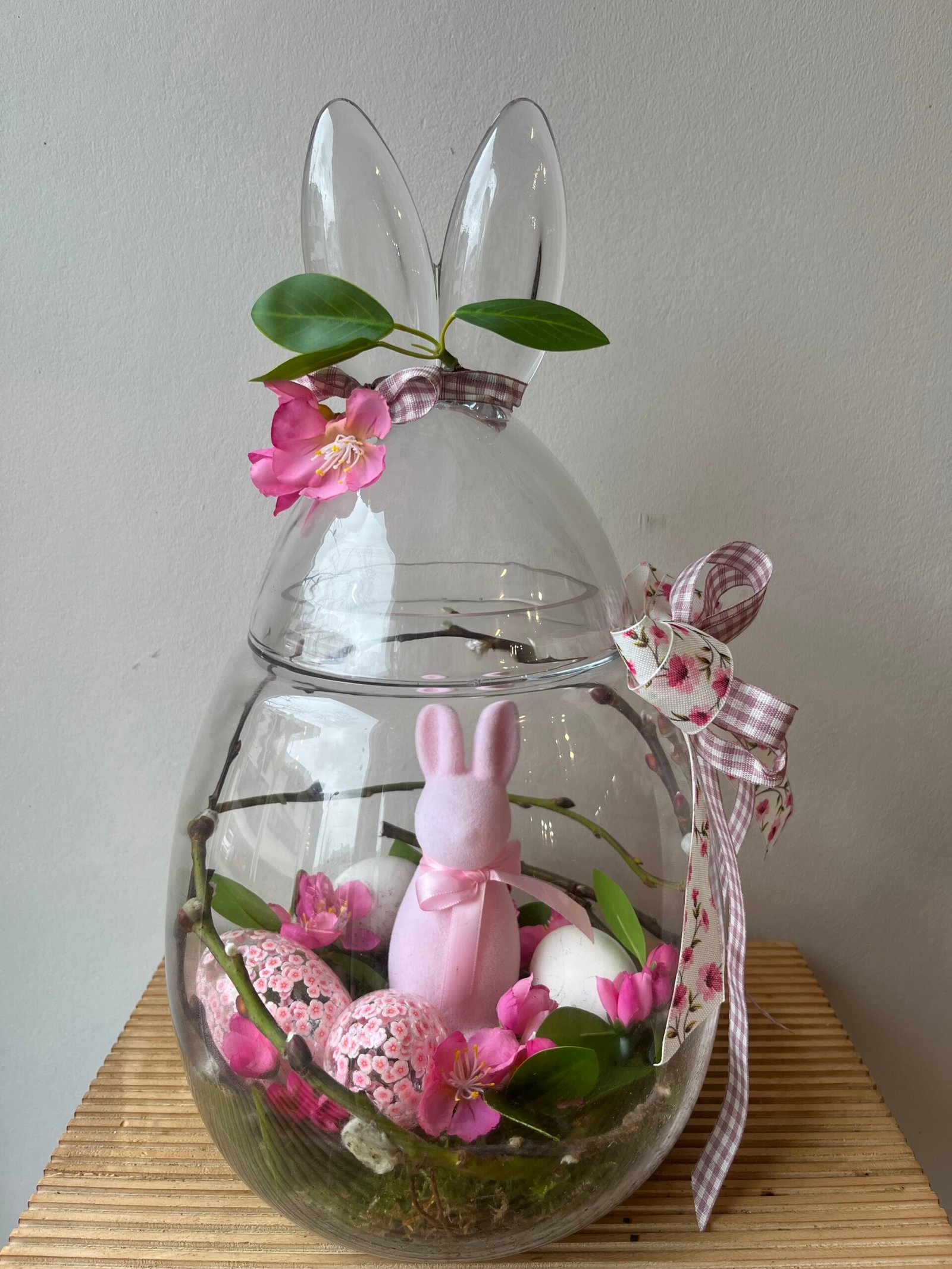 Œuf de Pâques en verre avec à son intérieur, une jolie décoration, composée de lapin et de prunus